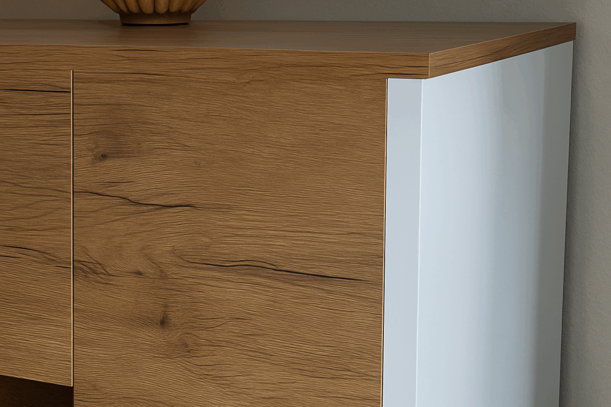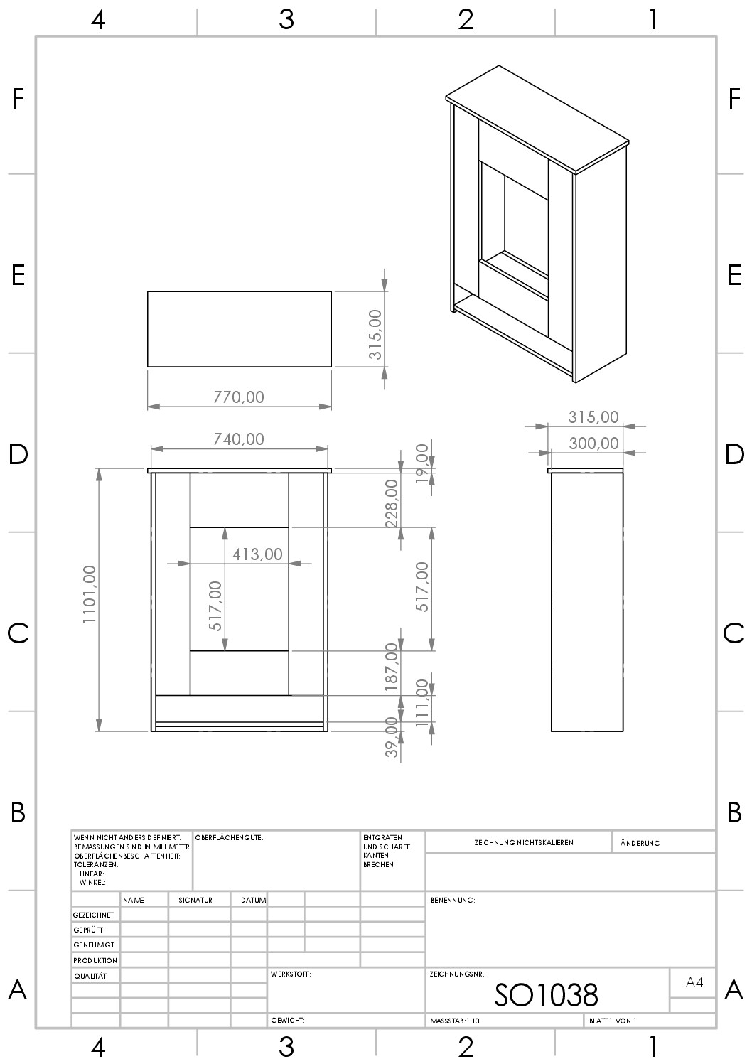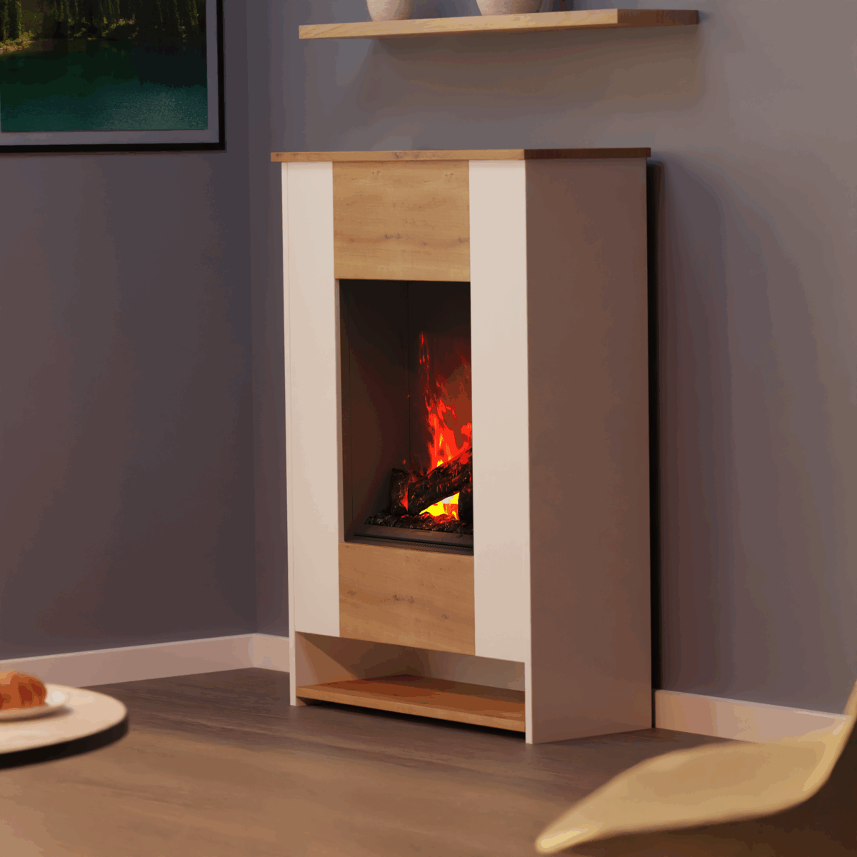 Das elegante Gehäuse in Holzoptik mit weißen Seitenelementen fügt sich harmonisch in alle Wohnräume ein. Der offene Ablagebereich unter der Feuerstelle bietet zusätzlichen Stauraum für Dekoholz oder Wohnaccessoires – für eine besonders authentische Kaminoptik.