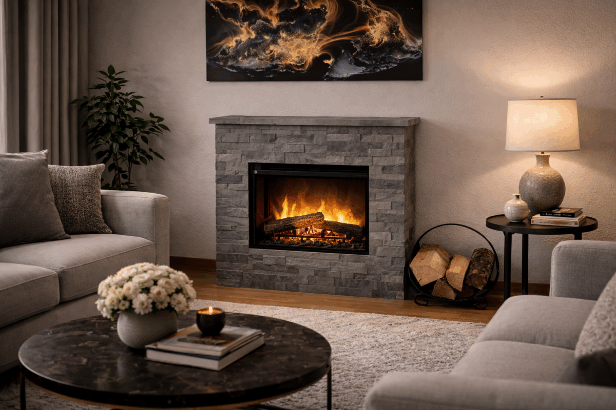 Elektrokamin Amrum Schiefer grau – mit Schieferoberplatte ist das Highlight für Ihre Einrichtung