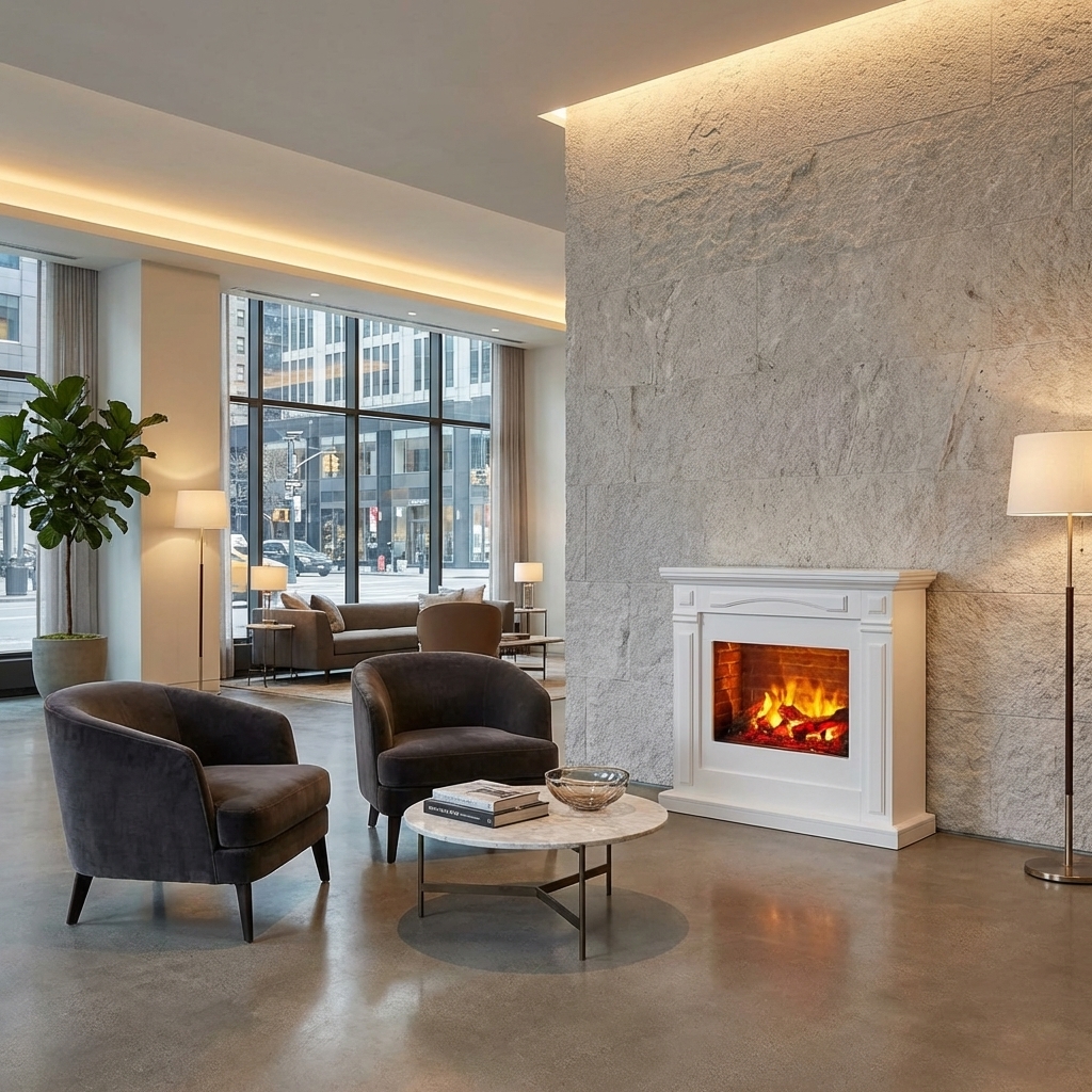 Der Aerzener Elektrokamin Calgary in brillant-weiß mit Steinrückwand
