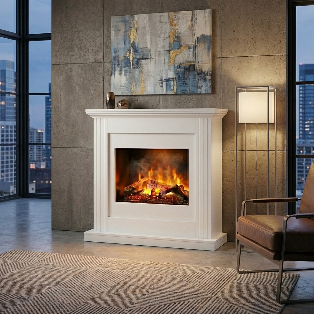 Der Aerzener Elektrokamin Ontario / Global de Luxe 61 überzeugt mit handwerklich, solider Verarbeitung und ansprechendem Design. Die effektvolle Handlackierung in brillantweiß macht diesen Kamin zum Blickpunkt jeder Einrichtung. Ein dezentes Fräsdekor unterstreicht die harmonische Gesamtwirkung, zu dem sorgt die verspiegelte Rückwand im Feuereinsatz für eine besondere Tiefe des 3D-Flammenbildes. An diesem Elektrokamin können Sie sich jeden Tag auf’s Neue freuen.