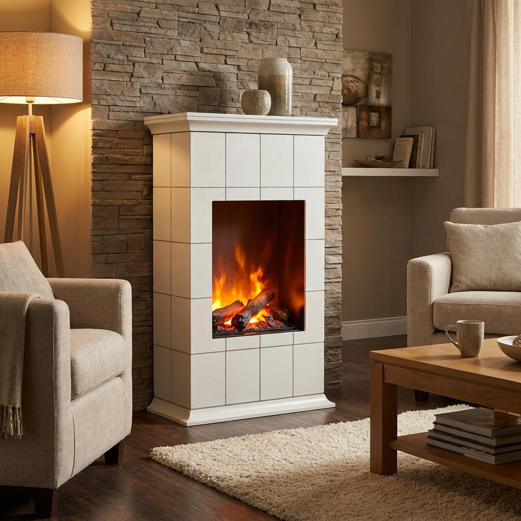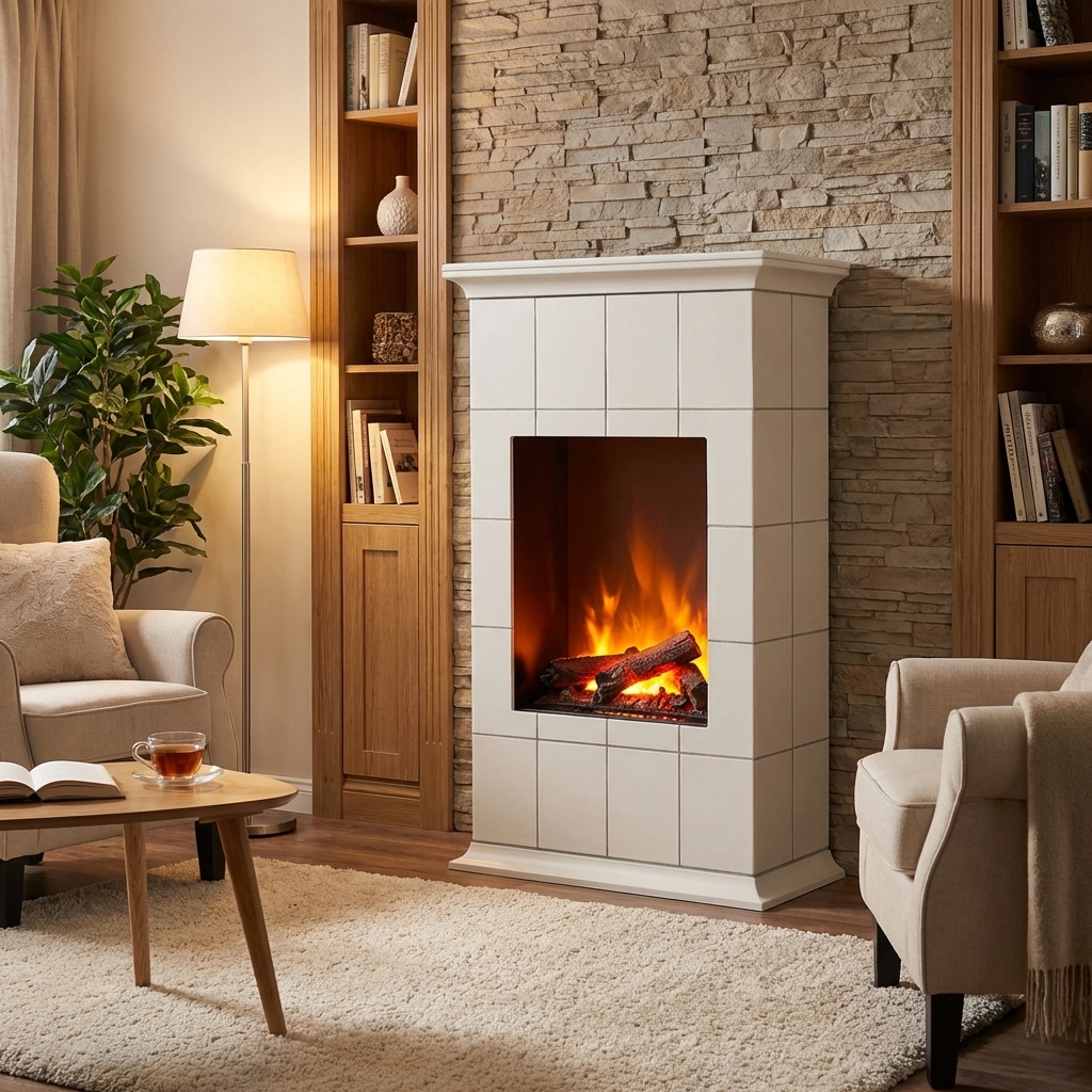 Der Aerzener Elektrokamin Sellin in weiß leicht antik patiniert