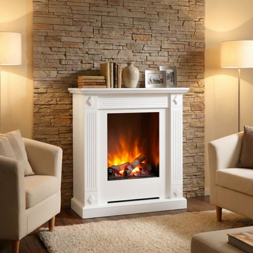 Der Aerzener Elektrokamin Sylt in brillant-weiß lackiert mit Optimyst-Inside 3D Wasserdampffeuer