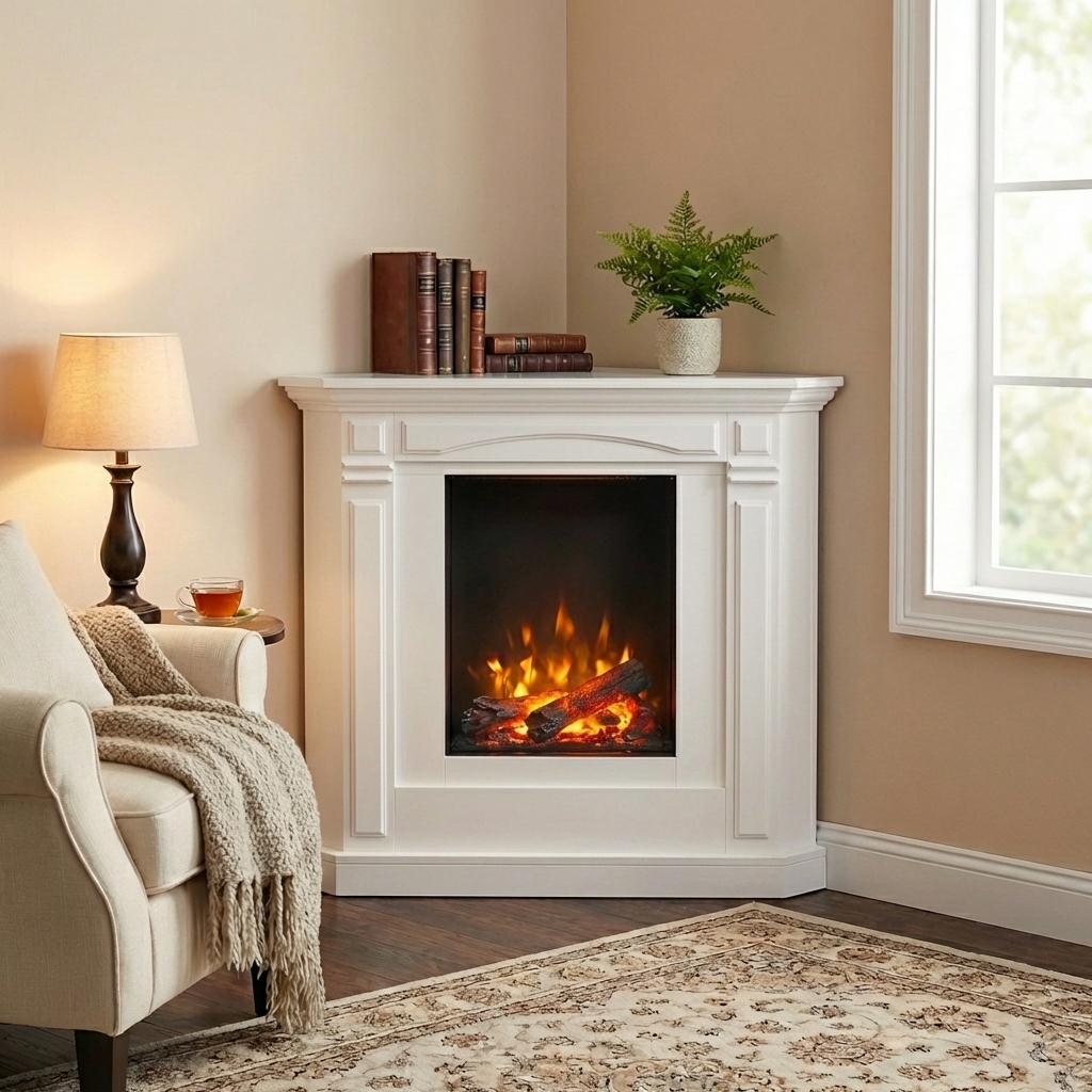 Der Aerzener Elektro-Eckkamin Tallin in brillant-weiß bietet solide Handwerkskunst und innovative Technik