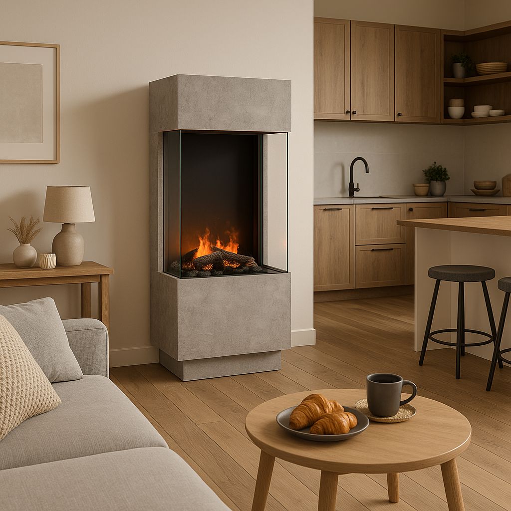Der Elektrokamin Glow Fire OGF 1 in Beton-grau – tolle Feueransicht von 3 Seiten